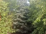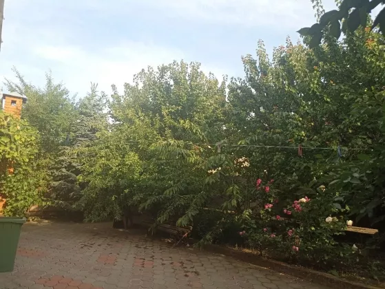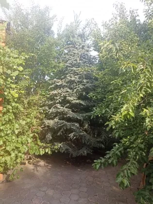 Двор мощеный плиткой, уютный сад с плодовыми деревьями и голубой елью.