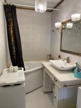 С/у совмещенный, очень уютный, в белом кафеле. Большая лоджия -12 кв.м., соединена с кухней - станет прекрасной обеденной зоной с приятным видом на двор.
